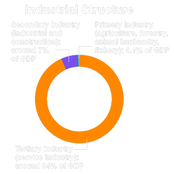 - Primary industry (agriculture, forestry, animal husbandry, fishery): 0.1% of GDP