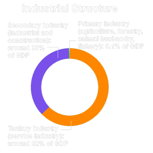 - Primary industry (agriculture, forestry, animal husbandry, fishery): 0.1% of GDP