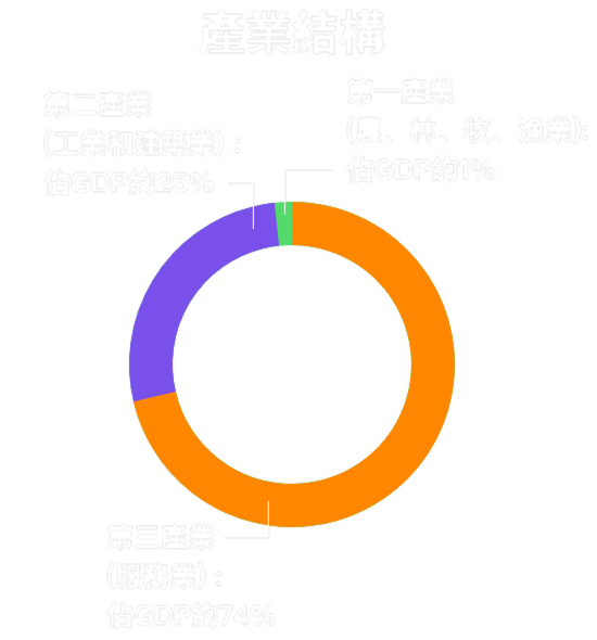 - 第一產業(農、林、牧、漁業):佔GDP 1.1%