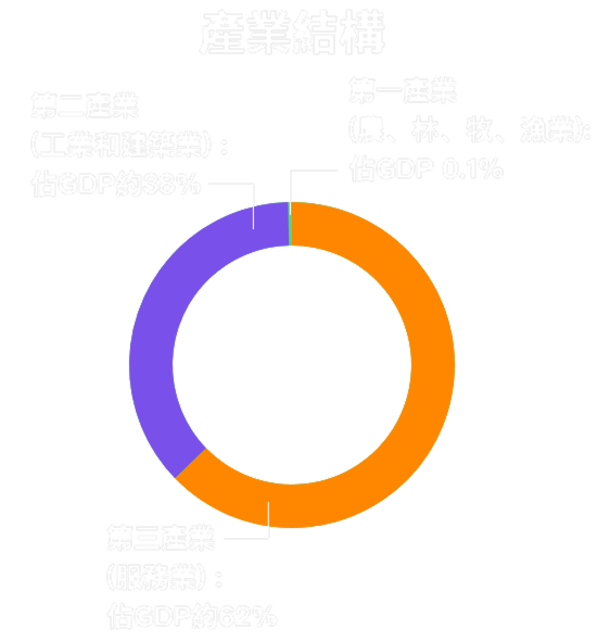 - 第一產業(農、林、牧、漁業):佔GDP 0.1%